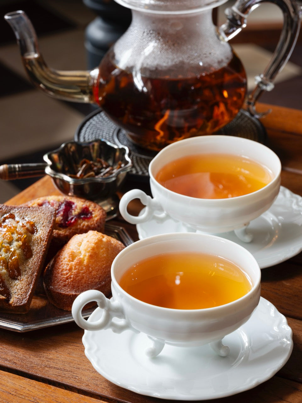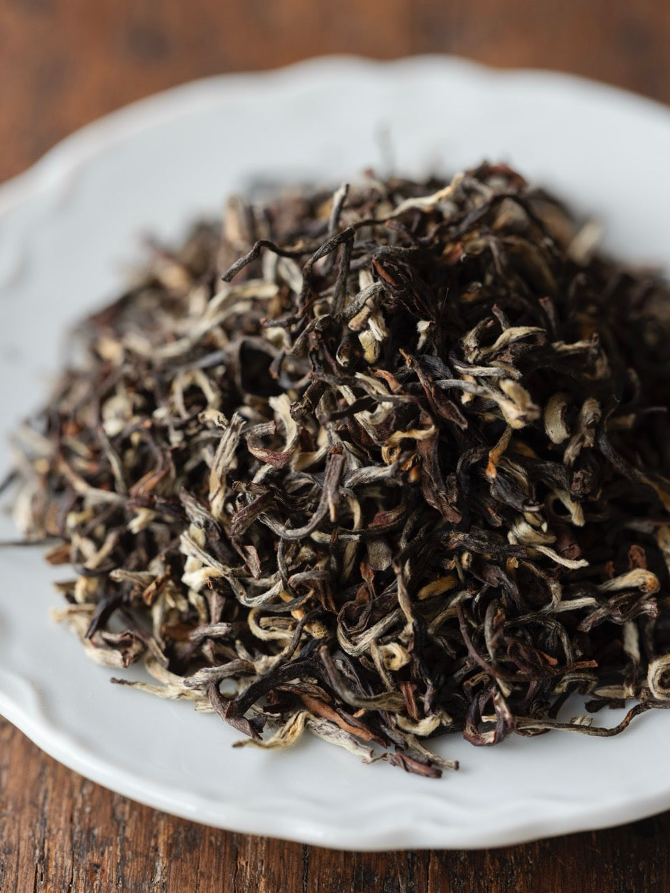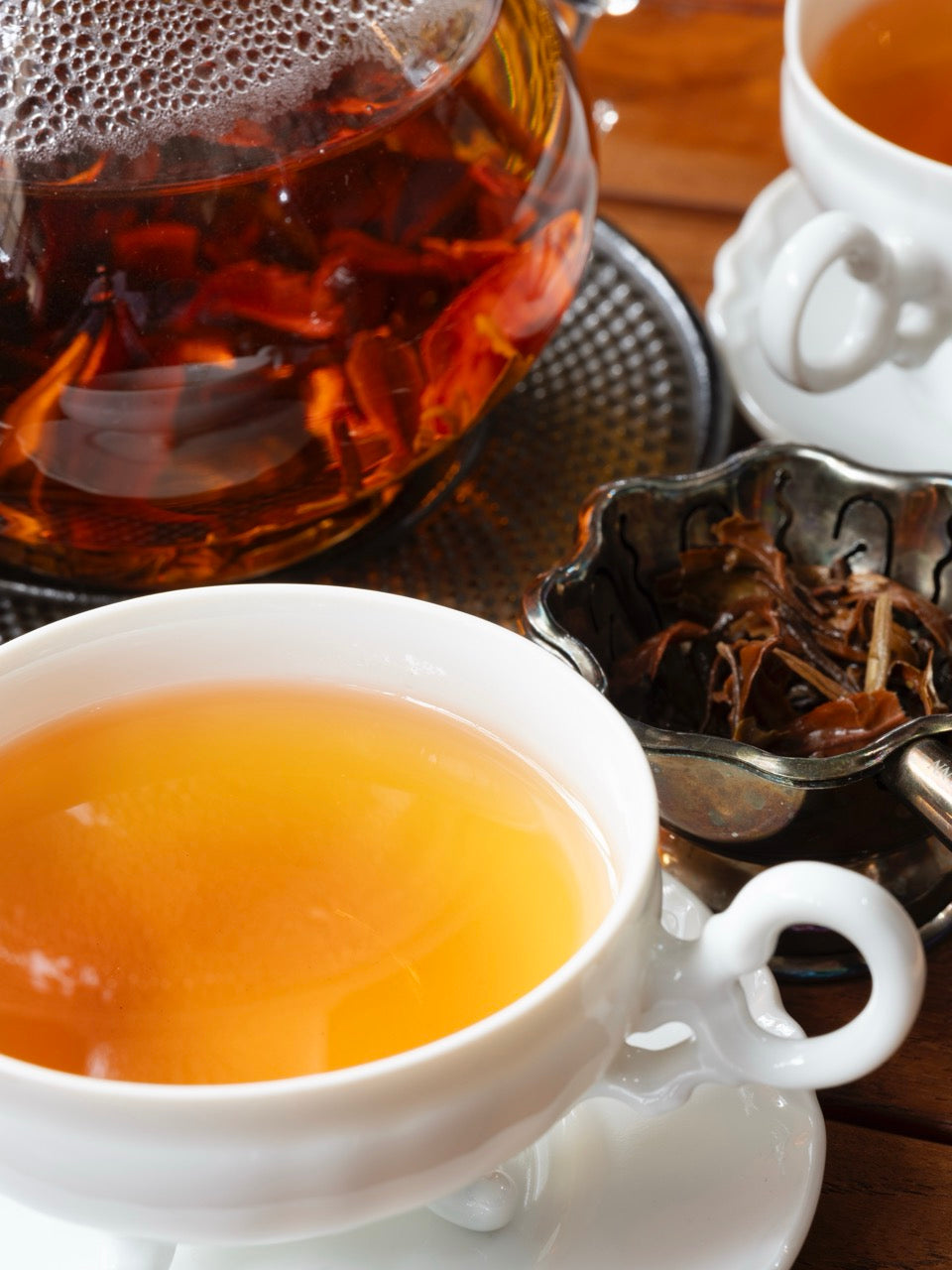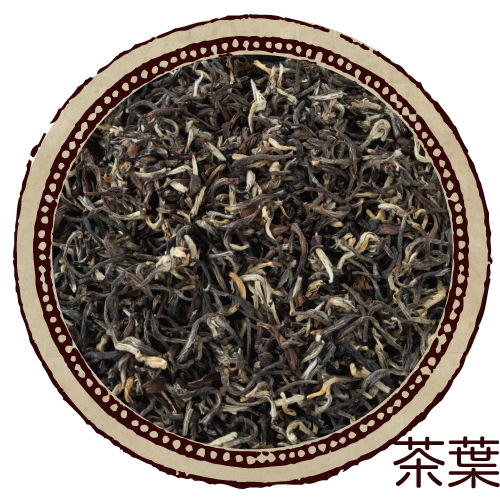 象牙色の芯芽がふんだんに散りばめられたリーフ は、ティーポットの中でゆっくりと広がり、オレンジブラウンの茶液となります。立ち上る香りはハーブのよう。