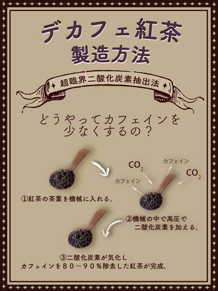 良質なセイロン産の紅茶を、二酸化炭素を使い安全にカフェインを取り除く「超臨界二酸化炭素抽出法」によりカフェインを80%~90%除去。いつもの味わいのまま、カフェインの少ない紅茶をお楽しみいただけます。