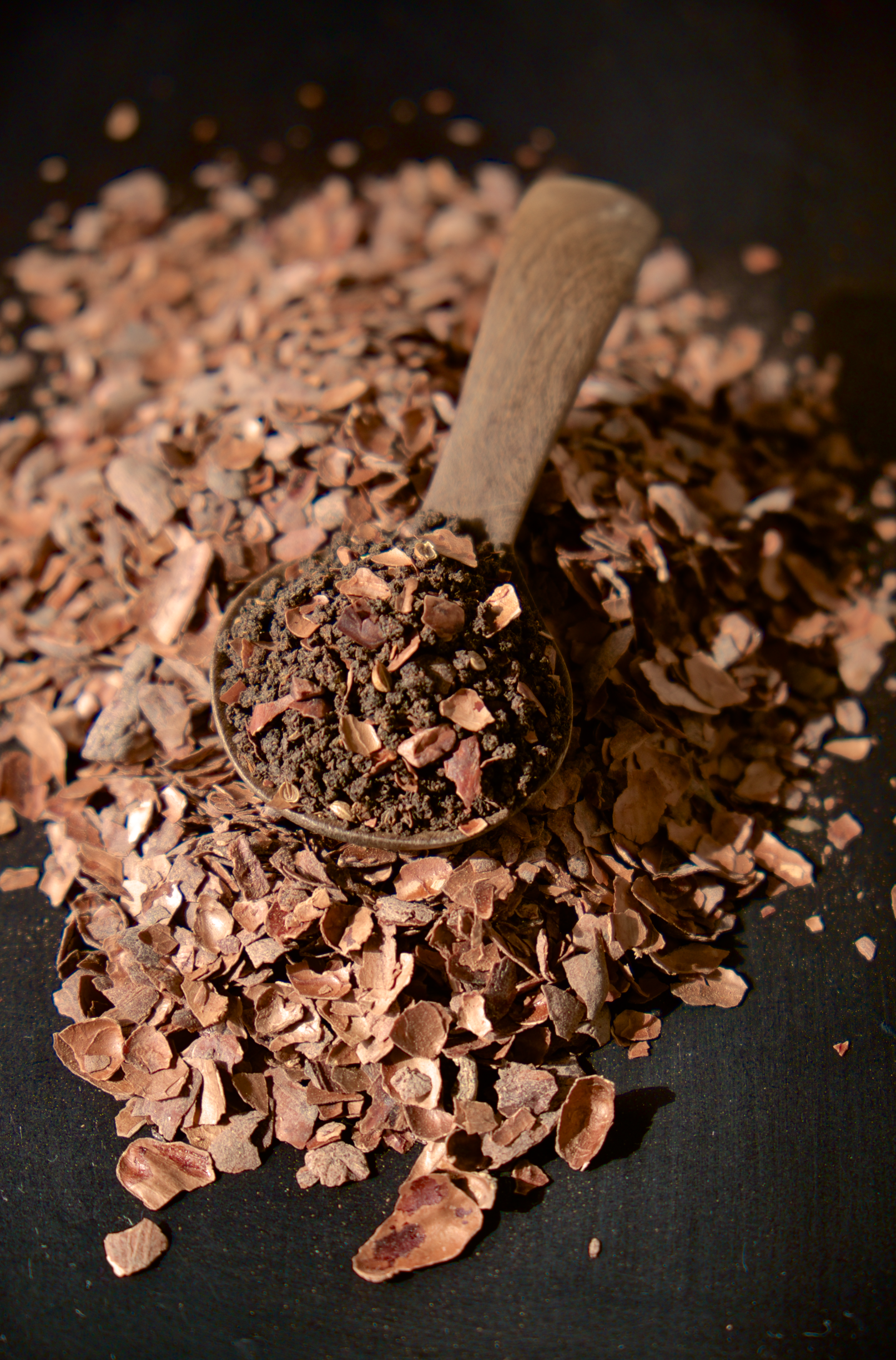 カカオピールは、チョコレートの原料となるカカオビーンズの外側の皮のこと。ローストした後、カカオの果肉と選別されるもので、ほんのりとしたカカオの香りと、やさしい甘味、そしてビターチョコのような心地よい渋みが特徴です。