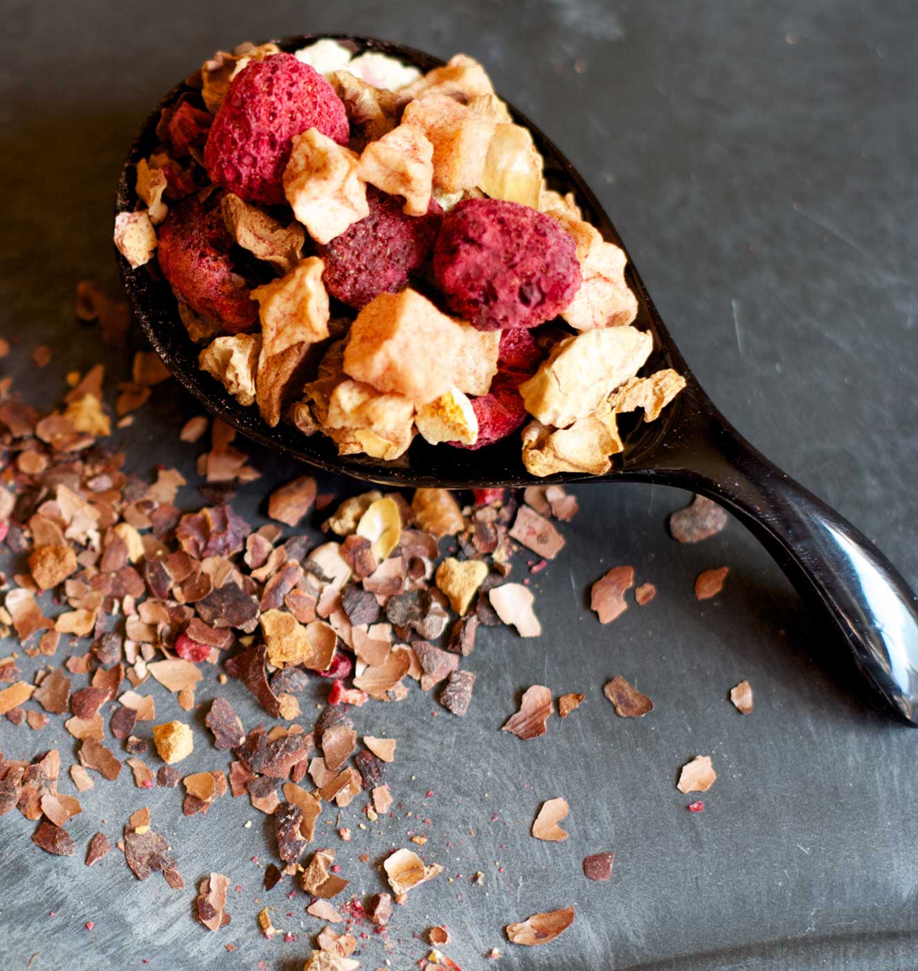 相性抜群の2つの香りをベースに、丸ごと乾燥させたフランボワーズやざく切りリンゴ、カカオピールなど、酸味が控えめの素材を選りすぐり、ブレンドしました。
