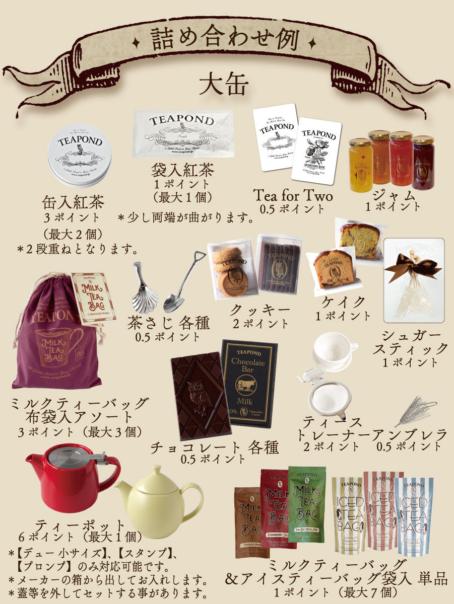 *お選びいただいた商品が大缶に入り切らない場合は、別途、ご連絡させていただき、内容の調整をご相談させていただくことがあります。
