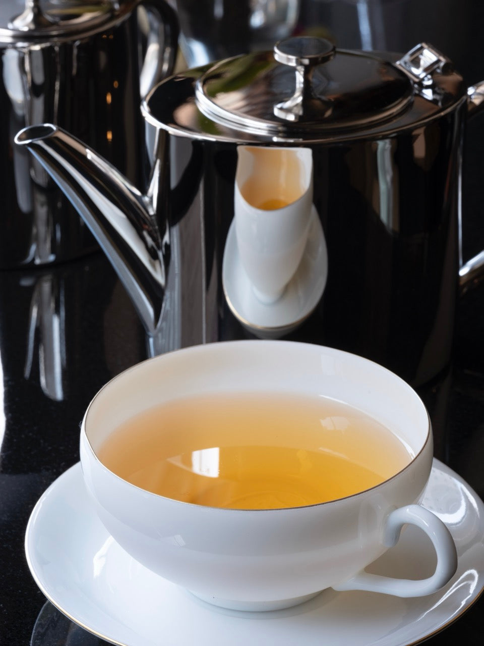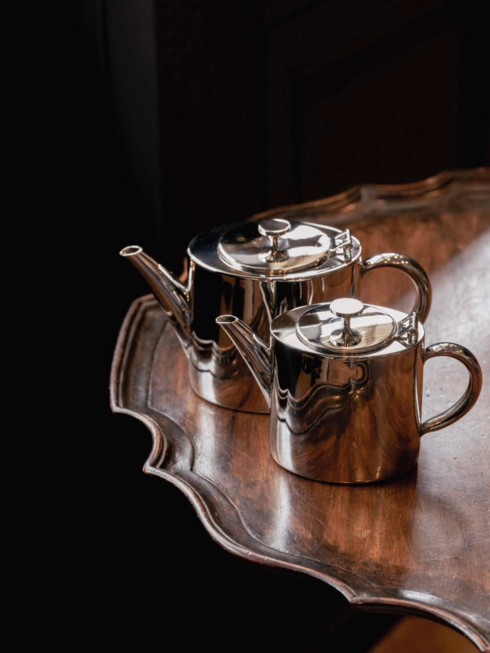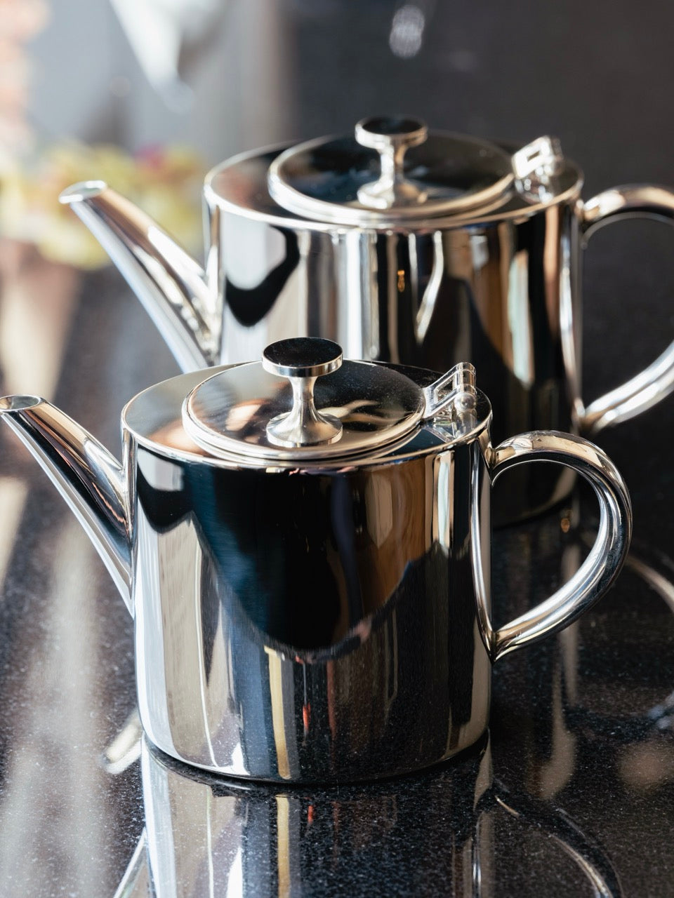 シンプルでモダンなフォルム。 ティーカップなどが本体に映り込み、 どんな茶器ともすっと馴染み様々なテーブルコーディネートにも柔軟に溶け込みます。