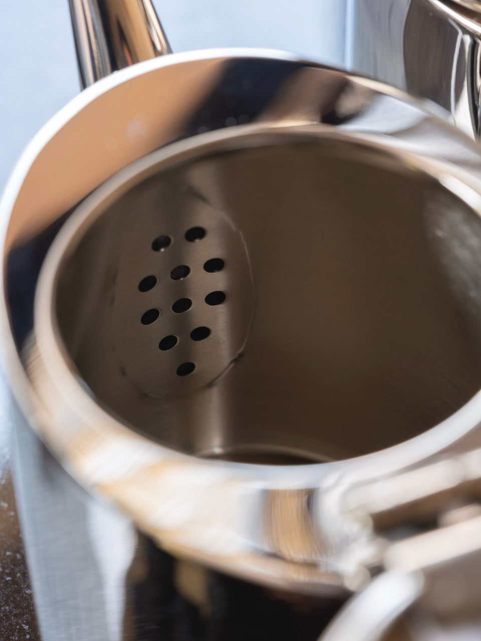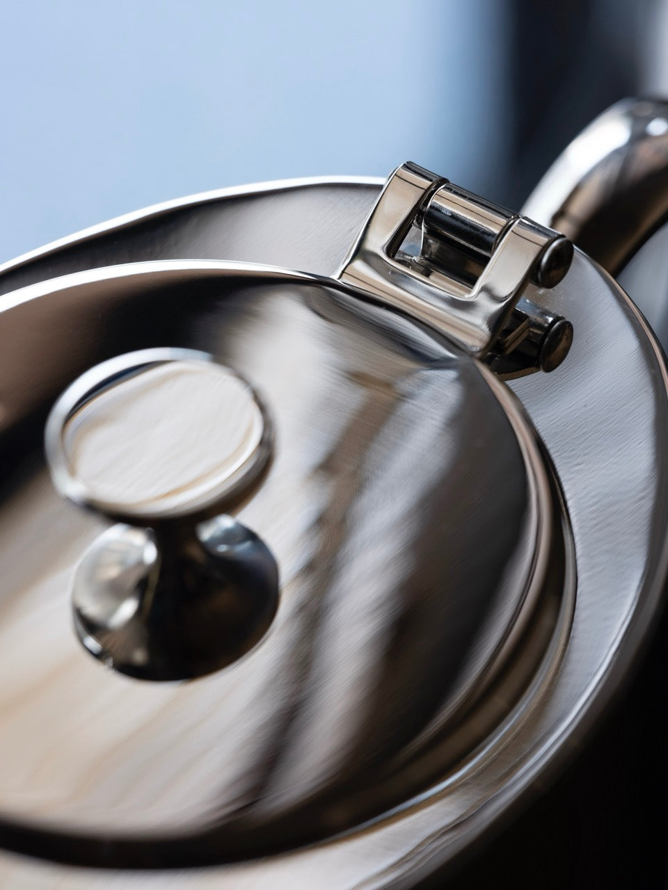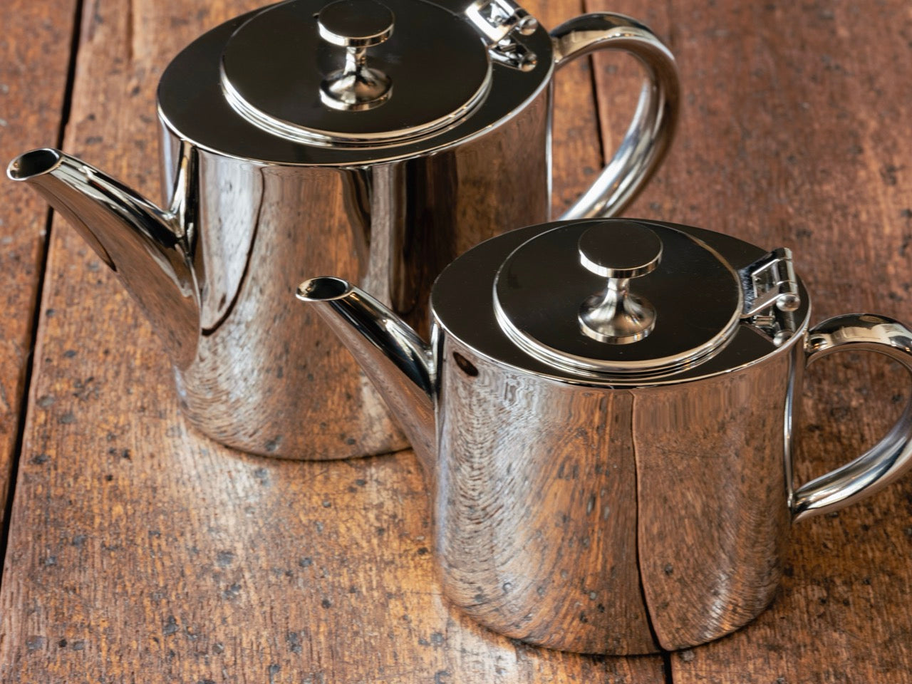 ポット全体が鏡のように美しく磨き上げられたステンレス製の国産のティーポットです。