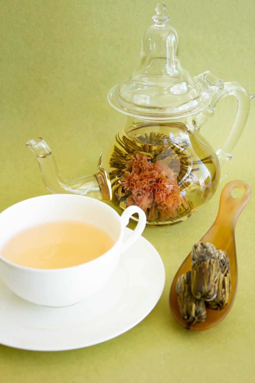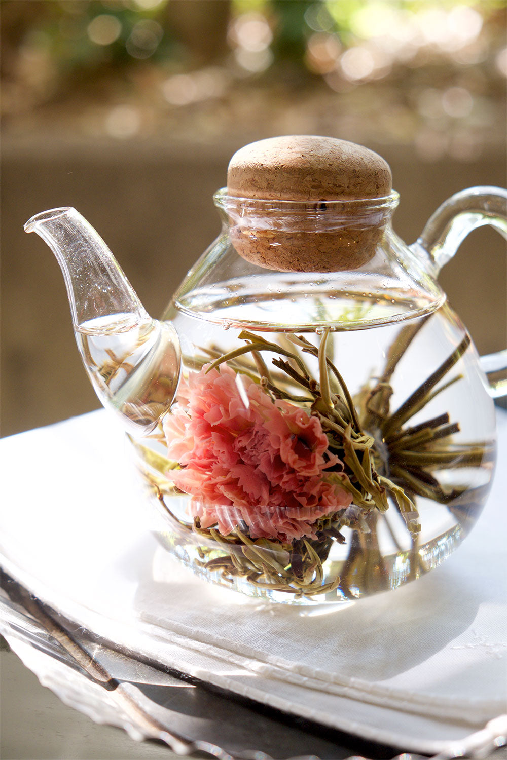 蕾の形をした茶葉にお湯を注ぐと、ゆっくりとひろがり、やがて花々の香りとともにカーネーションが美しく花咲きます。芯芽を多く含んだ茶葉からは甘美な味わいが溶け出し、味と香りに加え、目にも華やかなティータイムを演出します。