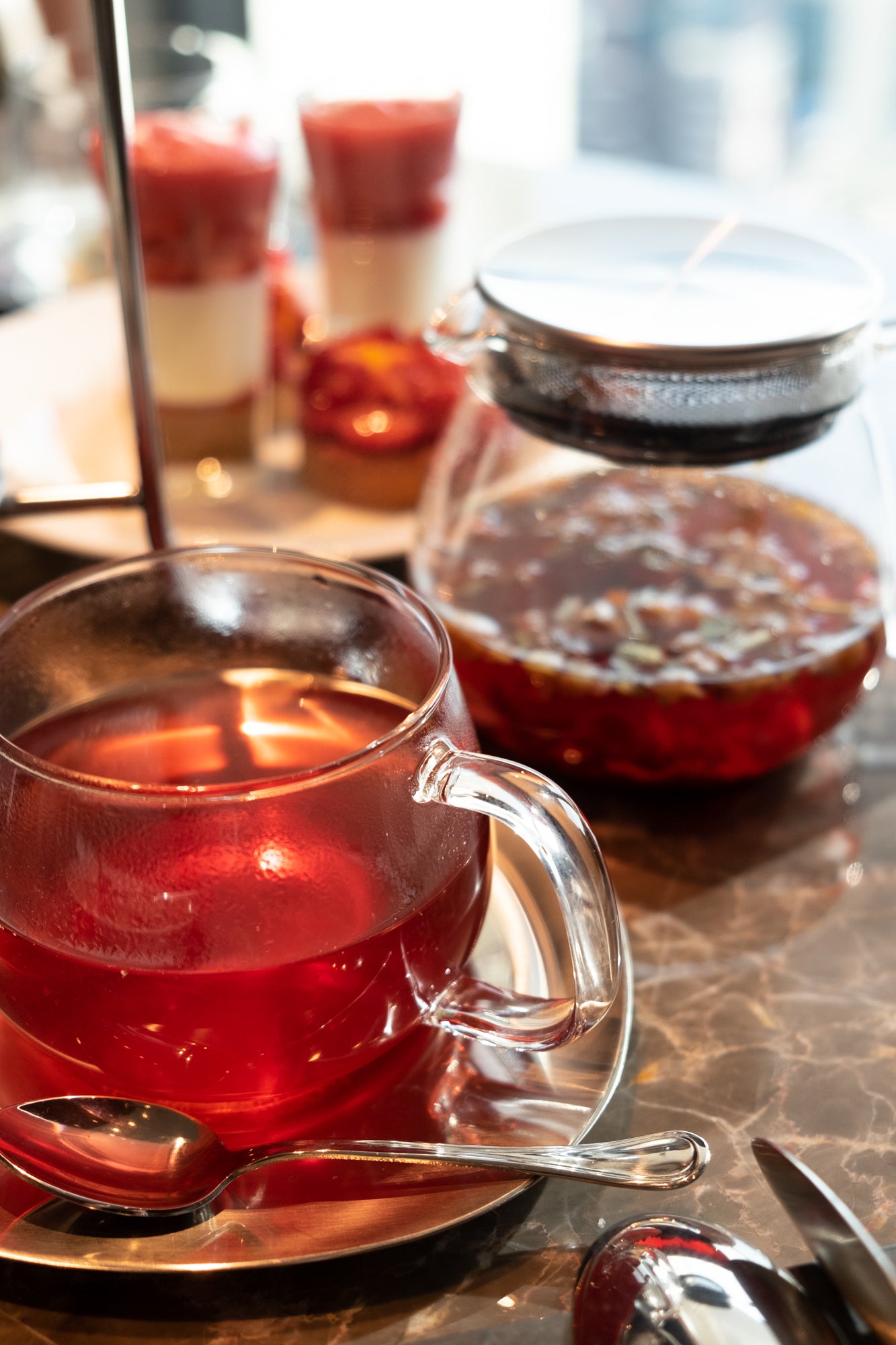 いくつものハーブやドライフルーツが入った茶葉はぜひ、ガラスのティーポットで抽出して、その姿も楽しみたい銘柄です。