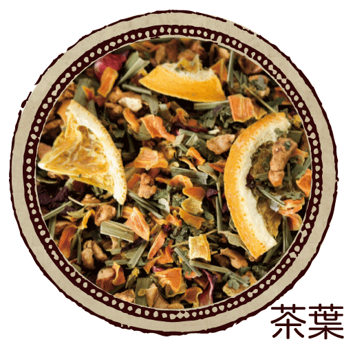 グリーンハーブと柑橘のピールを中心に、ハイビスカスやりんご、人参など甘さや酸味を持った素材をブレンド。